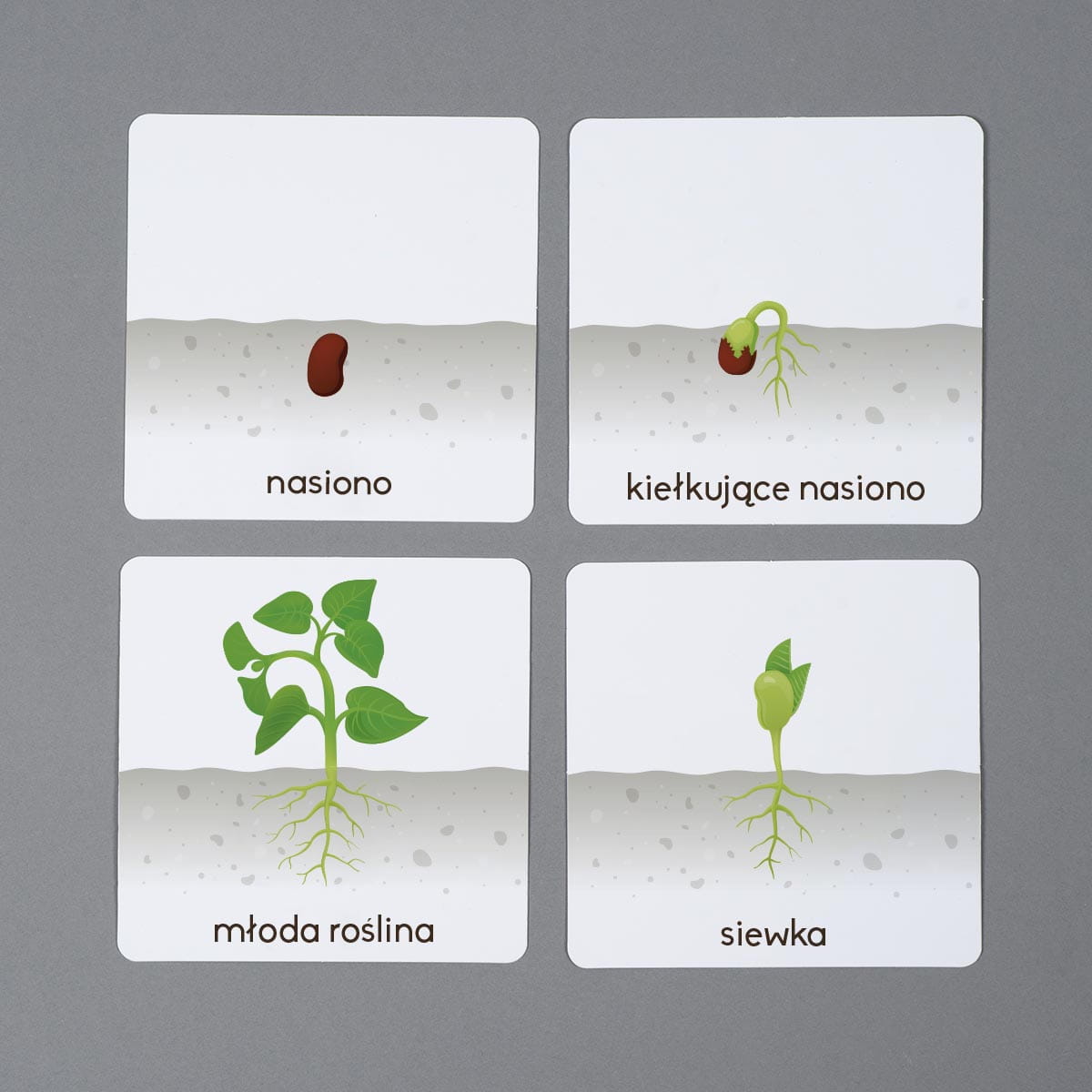 Karty przedstawiają poszczególne stadia rozwoju fasoli, od nasiona po młodą roślinę. Grafiki zostały przedstawione na białym tle, tak aby maksymalnie wspierać skupienie uwagi u dzieci. Zestaw zawiera również kartę kontrolną ukazującą kierunek rozwoju fasoli oraz dojrzałą roślinę. Plakat oraz pasujące memory umożliwiają dodatkowe aktywności.