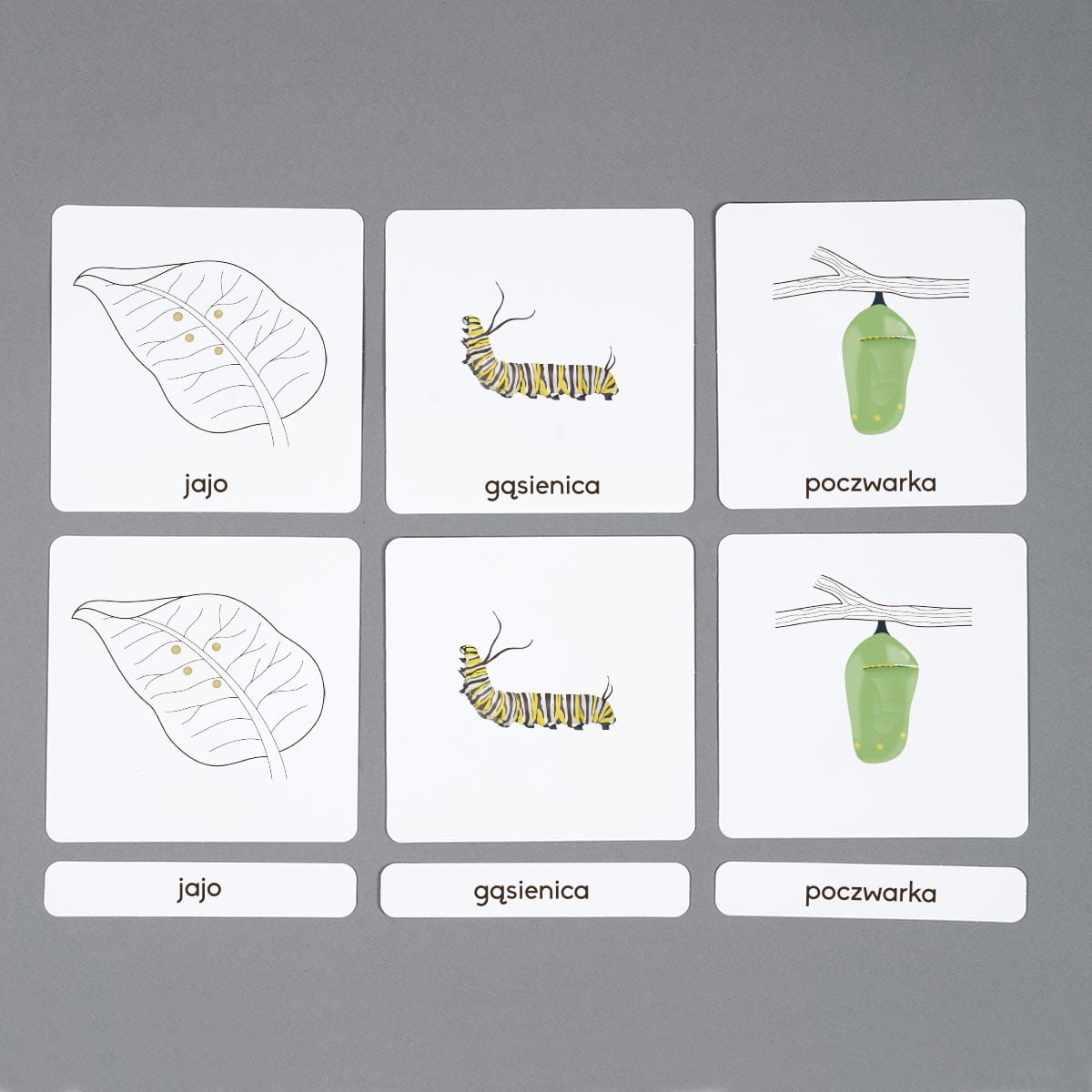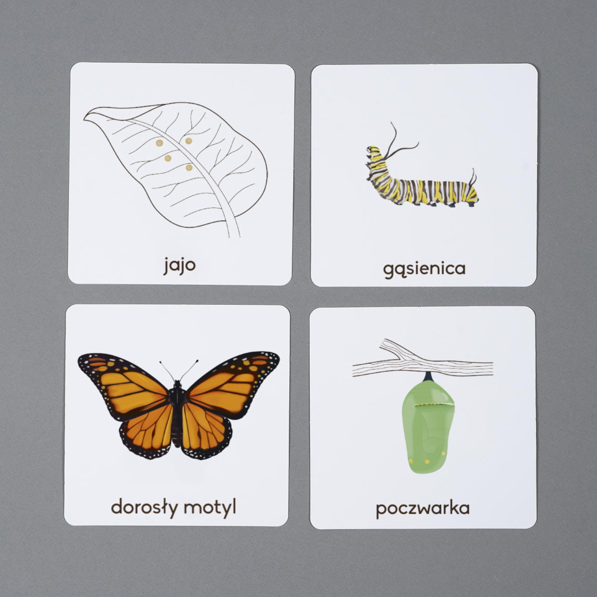 Karty przedstawiają poszczególne stadia rozwoju czyli jajo, gąsienicę, poczwarkę oraz dorosłego owada. Zostały one pokazane na białym tle, tak aby maksymalnie wspierać skupienie uwagi u dzieci. Zestaw zawiera również kartę kontrolną ukazującą kierunek rozwoju motyla. Plakat i pasujące memory umożliwiają dodatkowe aktywności.