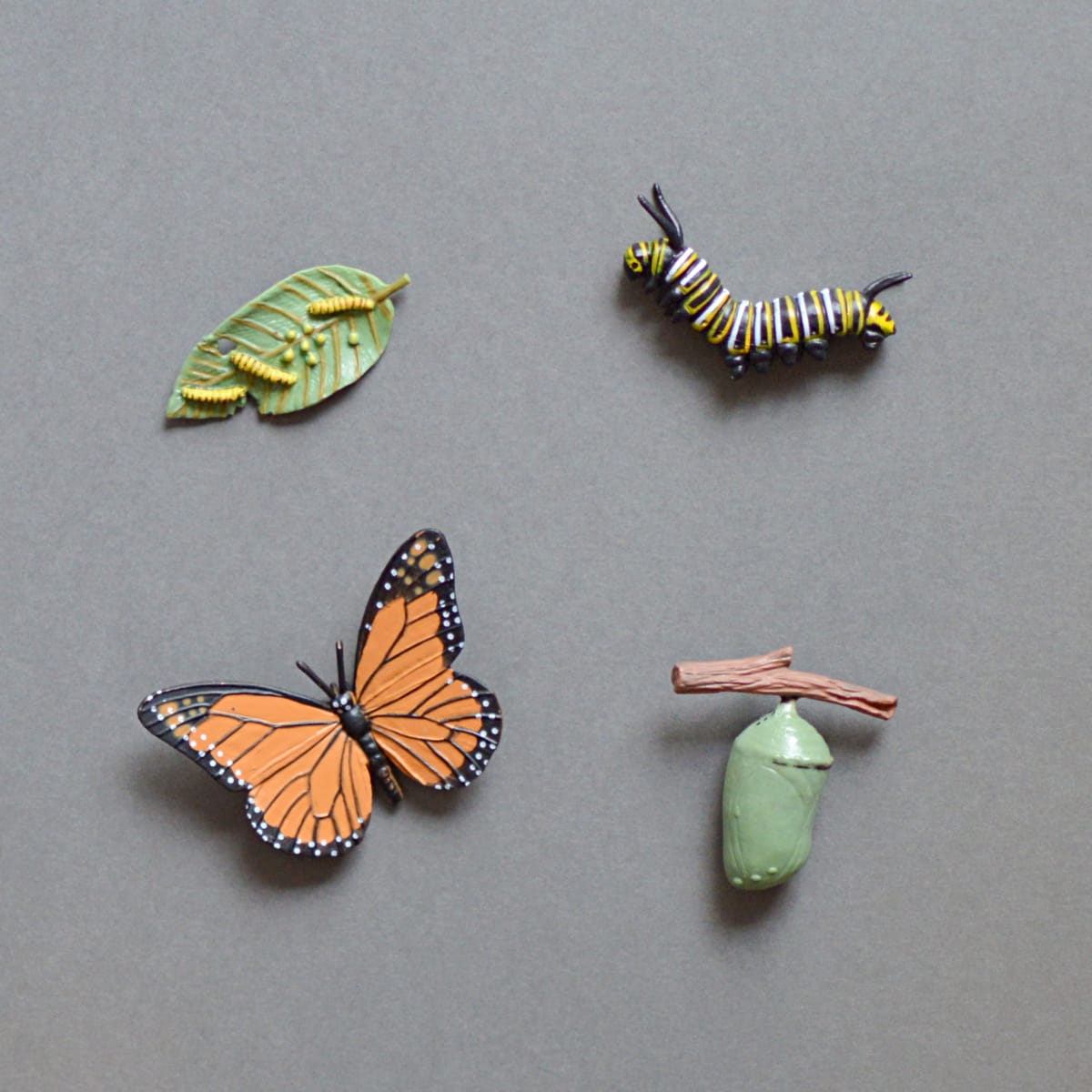 Komplet składa się z zestawu kart edukacyjnych oraz zestawu figurek, które prezentują cykl rozwojowy monarchy amerykańskiego.
