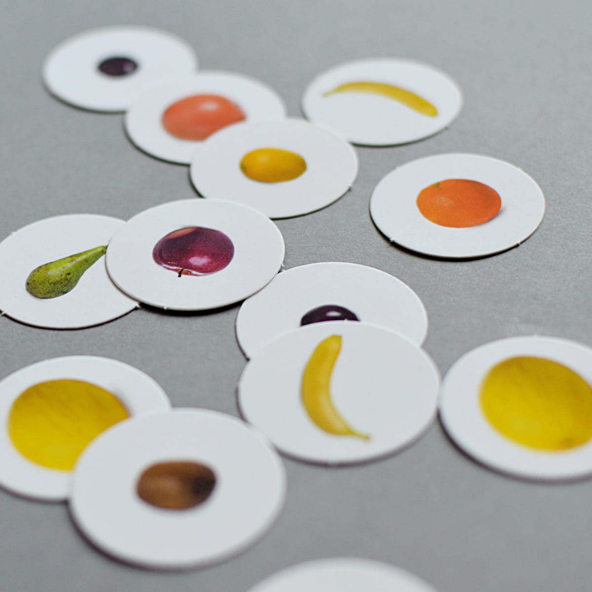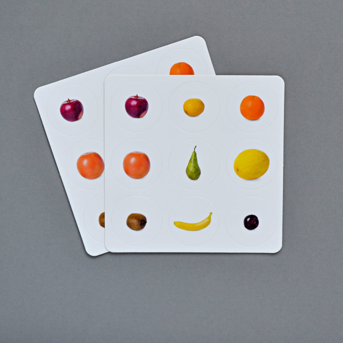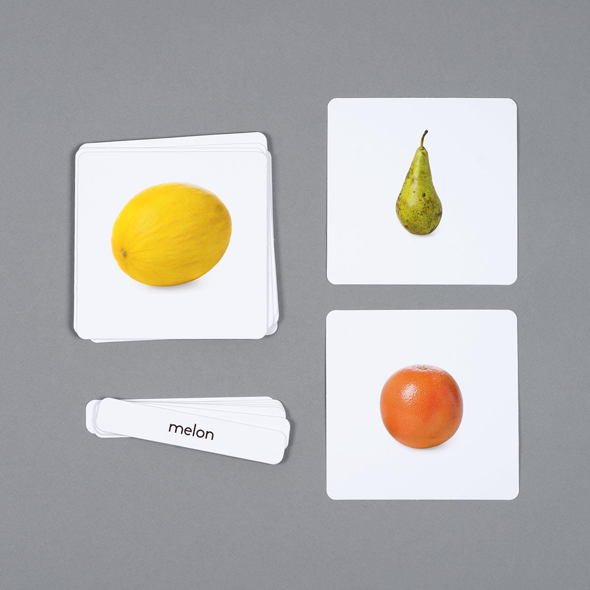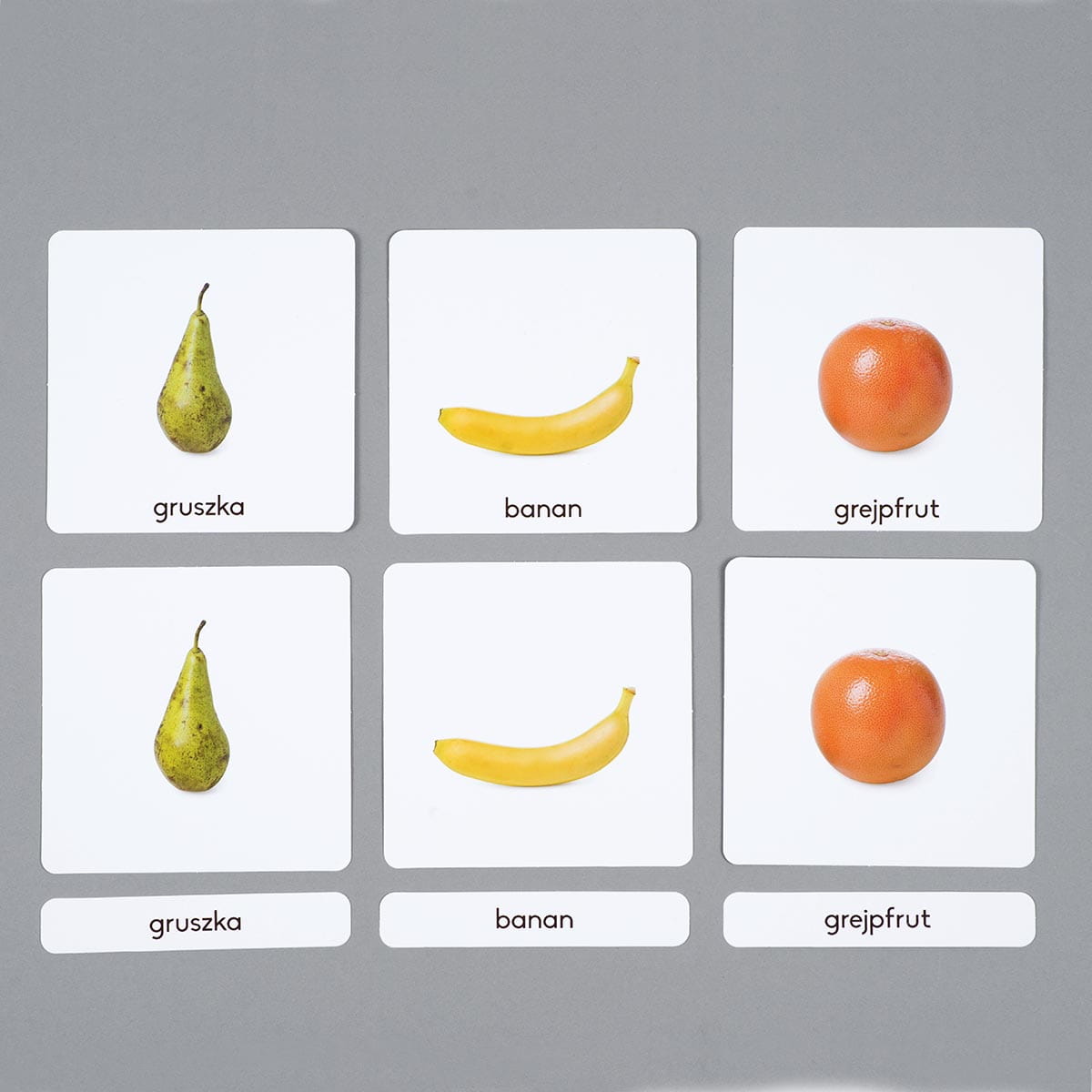 Karty są trójdzielne, co oznacza że zestaw zawiera dziesięć kart ze zdjęciem bez podpisu, kolejnych dziesięć takich samym kart, ale już opatrzonych podpisami oraz dziesięć podpisów. Taka konfiguracja pozwala na różnorakie wykorzystanie kart. Zdjęcia owoców przedstawione zostały na białym tle wspierając skupienie uwagi u dzieci. Karty służą do rozszerzania słownictwa metodą Marii Montessori, pomagają w nauce nazewnictwa i identyfikacji owoców, a jednocześnie pomagają wykorzystać fazę intensywnego rozwoju mowy charakterystyczną dla dzieci w wieku przedszkolnym.