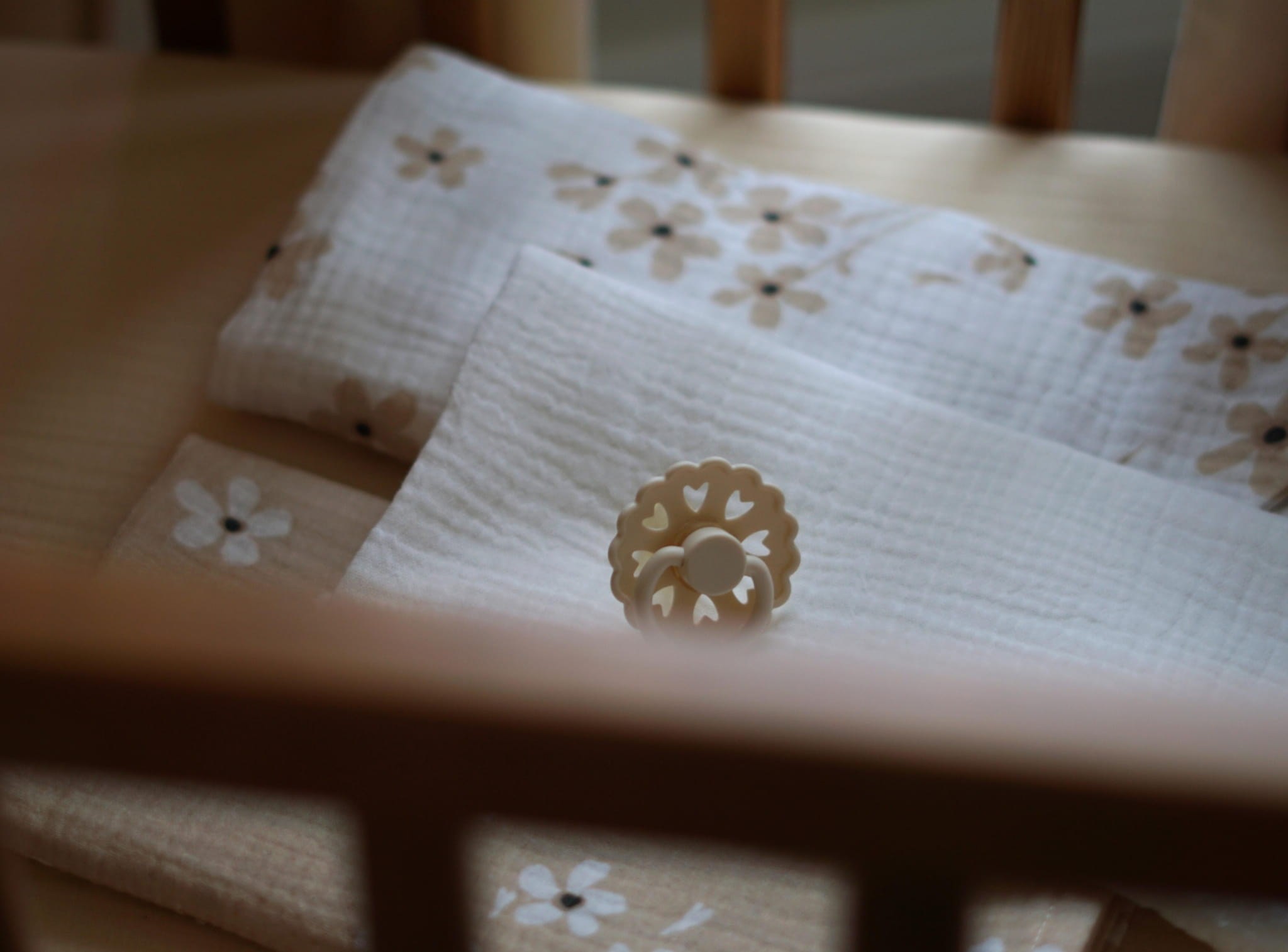 100% naturalny muślin bawełniany – wyjątkowo miękki, oddychający i bezpieczny dla skóry niemowląt.