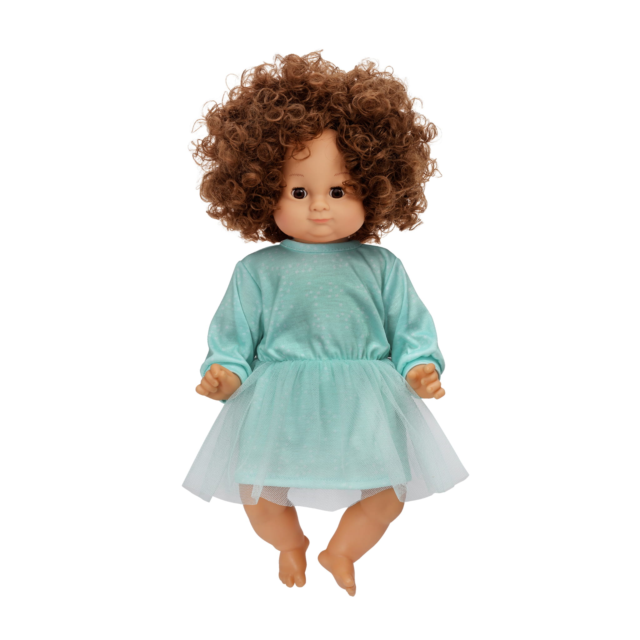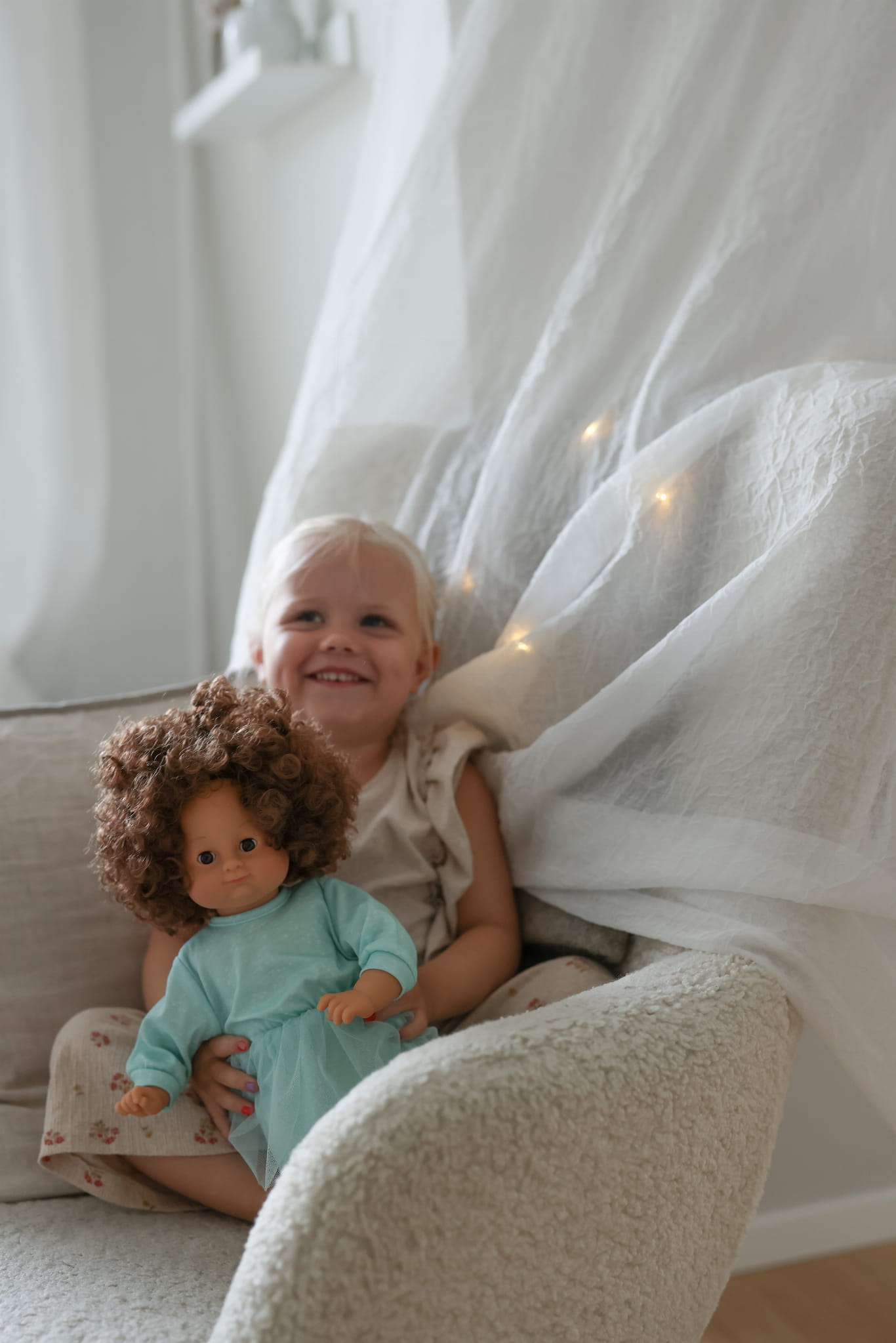 Urocza lalka w przepięknej błyszczącej tiulowej sukience ma brązowe kręcone włosy i właśnie poznaje świat. Chętnie odgrywa role i uczy emocji, a także pomaga poznać nowe słowa w obcym języku, np. angielskim. Jest mięciutka, więc możesz ją przytulać i zabierać ze sobą dokąd tylko chcesz. Utul ją i zobacz jak zamyka swoje oczy.