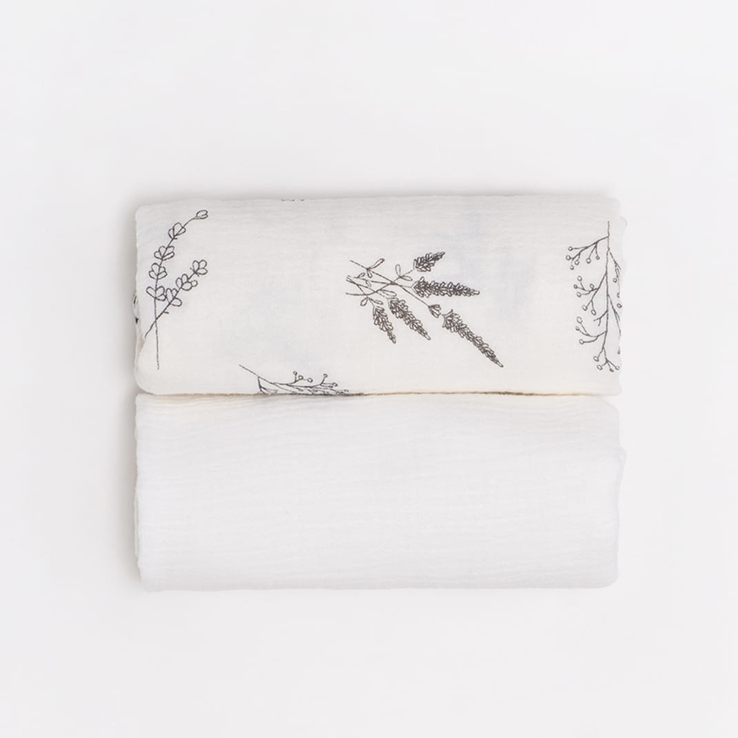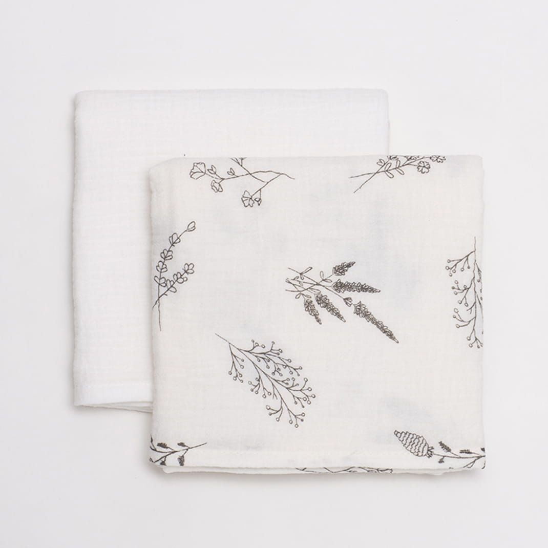 Zestaw dwóch muślinowych pieluszek to doskonałe uzupełnienie każdej wyprawki. Pieluszki mają wiele zastosowań. Idealnie sprawdzą się przy karmieniu i odbijaniu maleństwa. W zestawie znajdują się dwie pieluszki. Jedna z motywem roślinnym, druga gładka.