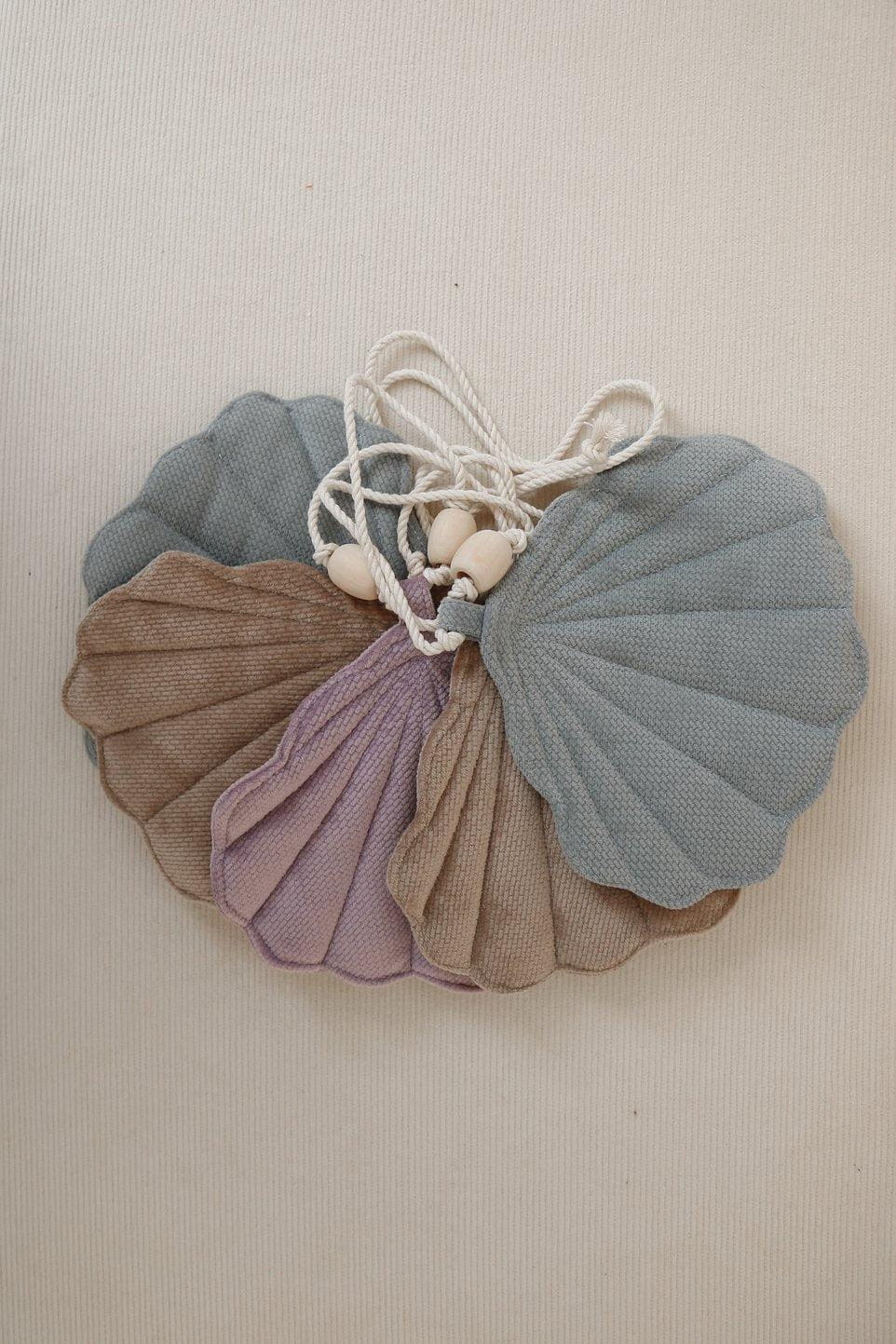 Girlanda wykonana starannie z 5 welwetowych muszelek (2 szaro-miętowe, 2 ciemnobeżowe,1 fioletowa), zawieszonych na bawełnianym sznurku ozdobionym drewnianymi koralikami.