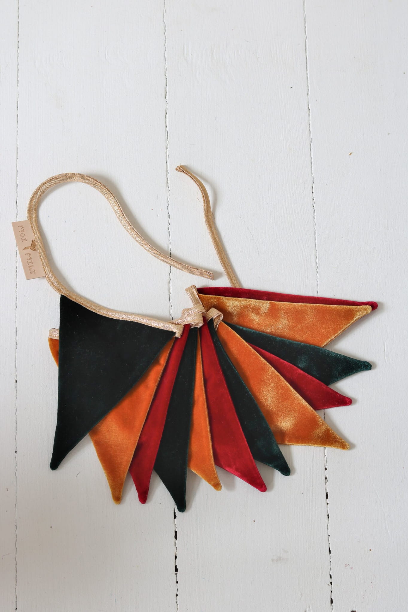 Niech rządzi naturalność i swoboda - w każdym pałacu, w każdej komnacie! Girlandy podkreślają wspaniałość zamieszkującego go księcia lub księżniczki, rycerza i wróżki. To samo dotyczy namiotów w ogrodzie :-)Girlandy dekorują każde wnętrze. Mogą posłużyć jako część scenografii teatrzyku, przyjęcia urodzinowego, balu karnawałowego. Potrafią zmienić dziecięcy pokój w magiczne królestwo, rozkręcić kinder party, stworzyć baśniową atmosferę do czytania książki przed snem.Girlandy to wspaniały dodatek do baldachimu, tipi, łóżeczka,dekoracji ściany, okna.Połącz nasze girlandy z baldachimami i poduszkami!Girlanda wykonana starannie ze złotych, czerwonych i zielonych proporczyków uszytych z miękkiego aksamitu przyszytych do lamówki.12 aksamitnych zawieszek przyszytych do lamówki, Tkanina: 100% welwet.Długość girlandy 2,2 m.