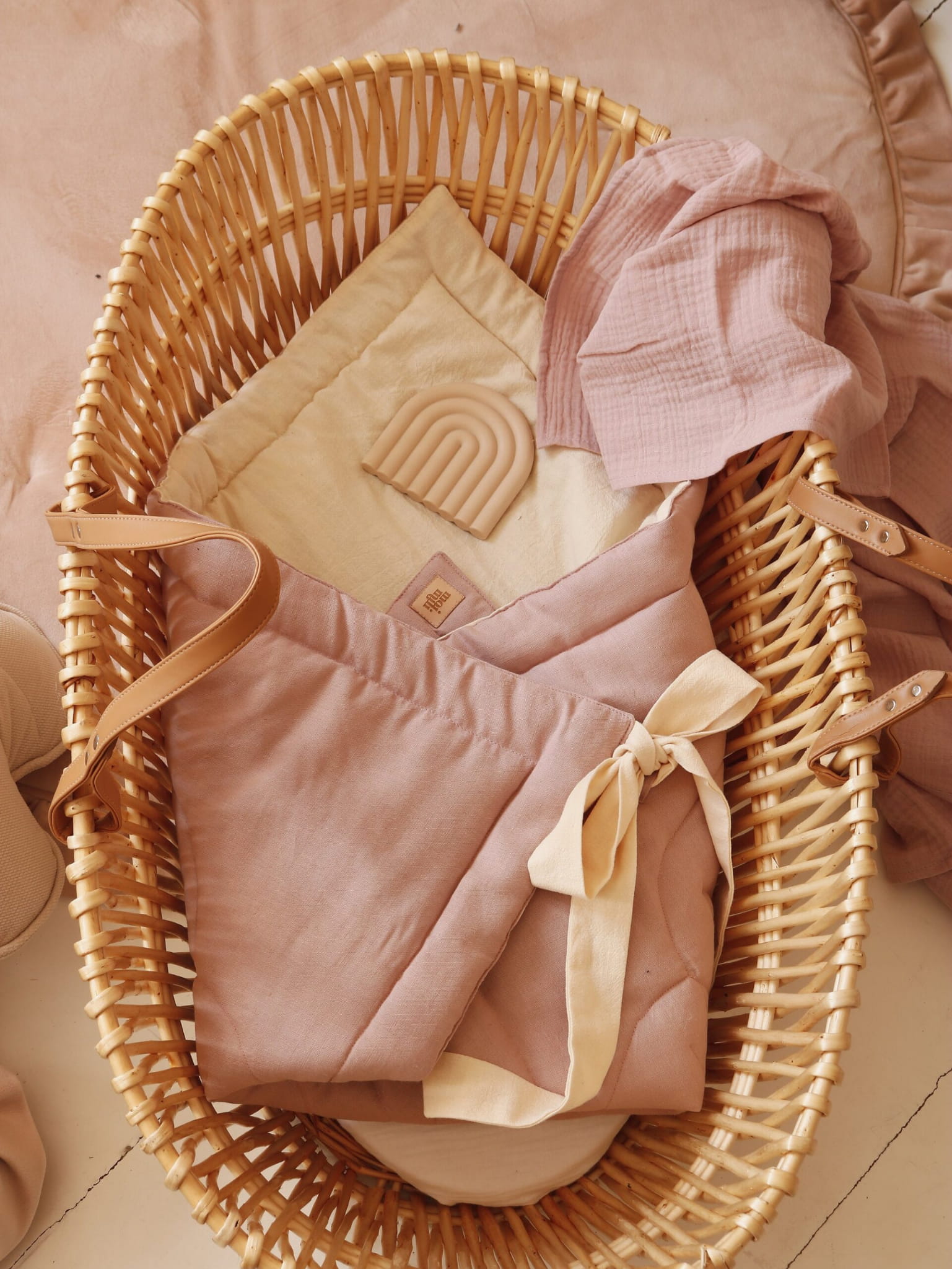 Starannie uszyte z lnu i bawełny, z wiązaniem i szlufką do zaczepiania zabawki. Przepikowane, co czyni je jedynymi w swoim rodzaju, po wewnętrznej stronie uszyte z pranej bawełny, po zewnętrznej - z lnu, wypełnione antyalergiczną owatą silikonową.Możesz skomponować wyprawkę z lnianą pościelą, muślinowym otulaczem i pieluszką.Rożki świetnie łączą się z naszą kwiatową kolekcją.