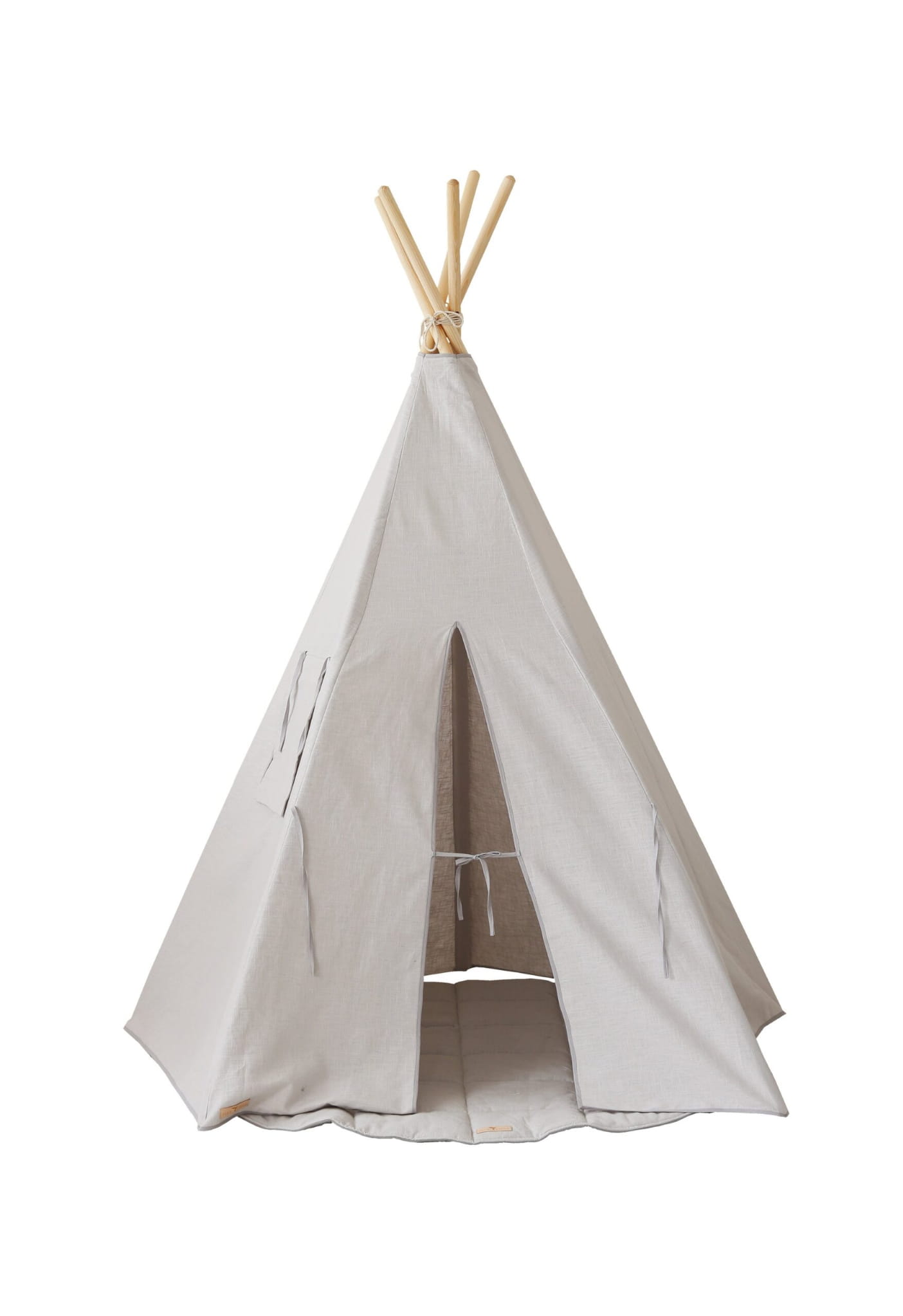 Tipi "Gołębi szary", solidnie uszyte z tkaniny lnianej, z myślą o miłośnikach stylu skandynawskiego. Jasnoszary odcień rozjaśnia wnętrze dziecięcego pokoju lub bawialni.