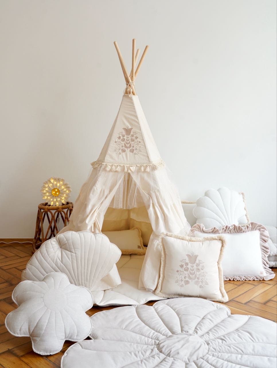 W skład zestawu wchodzi rozkładany namiot dla dzieci, kije i bawełniany pokrowiec. Zachęcamy do uzupełnienia go naszymi pięknymi dekoracjami i akcesoriami.